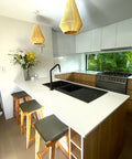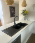 The Italian made Santorini 1 and 3/4 Offset Bowl with Drainer is ideal for those who enjoy a larger main bowl, with the practical addition of a 3/4 bowl. Santorini composite granite sinks are scratch resistant, impact resistant and heat resistant.