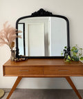 This antique style ornate overmantel wall mirror, available in gold or black will elevate your interior with this luxurious detailed solid wood frame finished in a rich antique gold. Measuring 116cm high by 101cm wide, this elegant mantel piece is adorned with intricate floral and scrollwork details, evoking classic French and Victorian influences.
